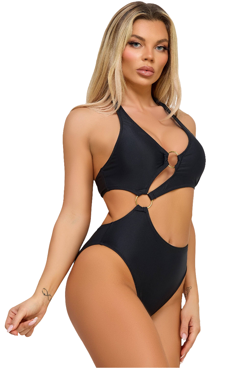 Turn heads with the Lorelei Swimsuit, a stunning blend of modern design and sophisticated flair. This swimsuit features daring cut-outs strategically connected by sleek metallic rings, creating a striking silhouette that exudes confidence and style. * Halter neckline with a sexy front opening * Cut-out waist attached by sleek metallic rings * Medium coverage bottom For optimal care gently hand wash in cold water with mild detergent, and lay flat to air dry/ Do not bleach/ Do not tumble dry/ Do not iron/ Do not dry clean.Needs to come with a Hygienic liner.