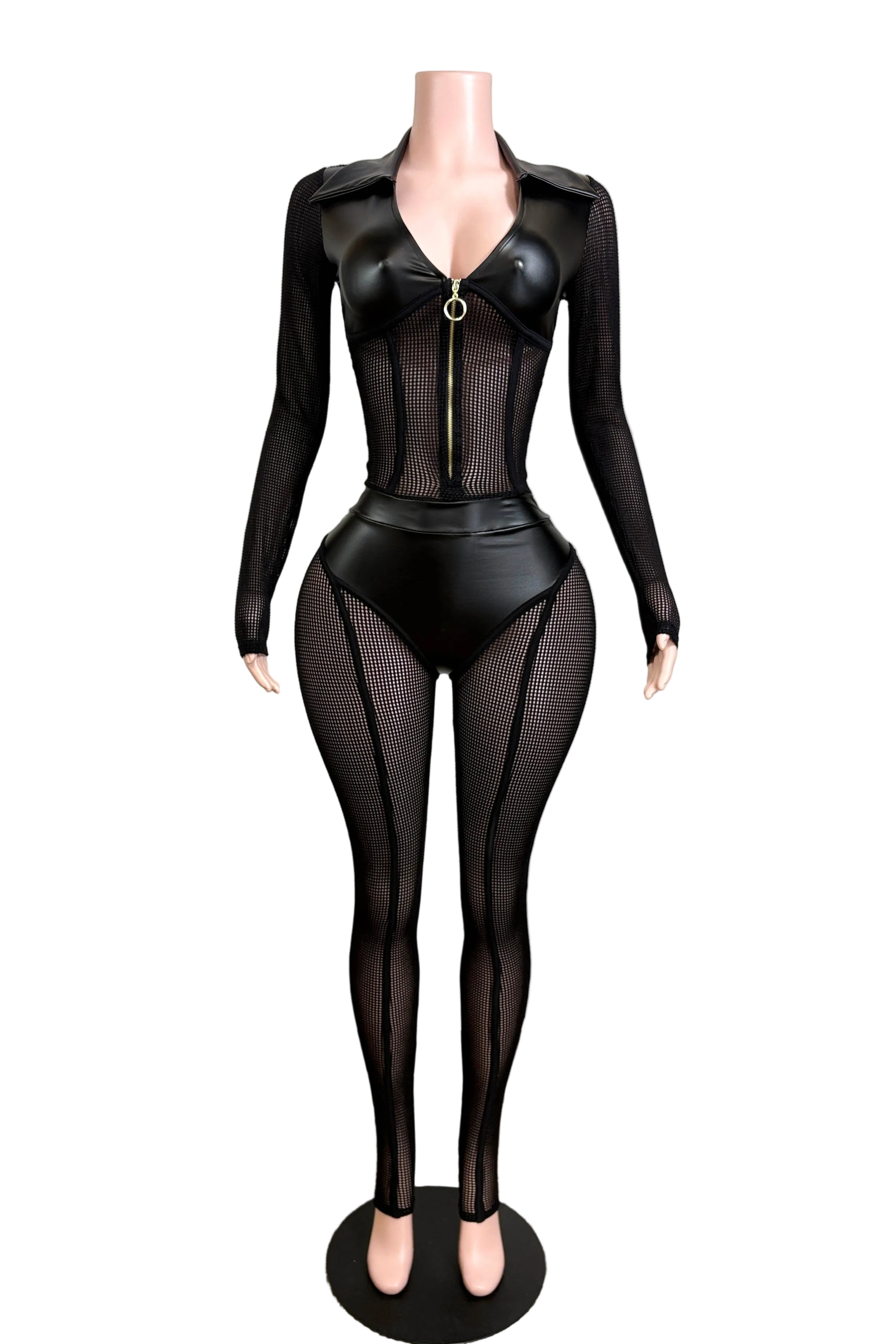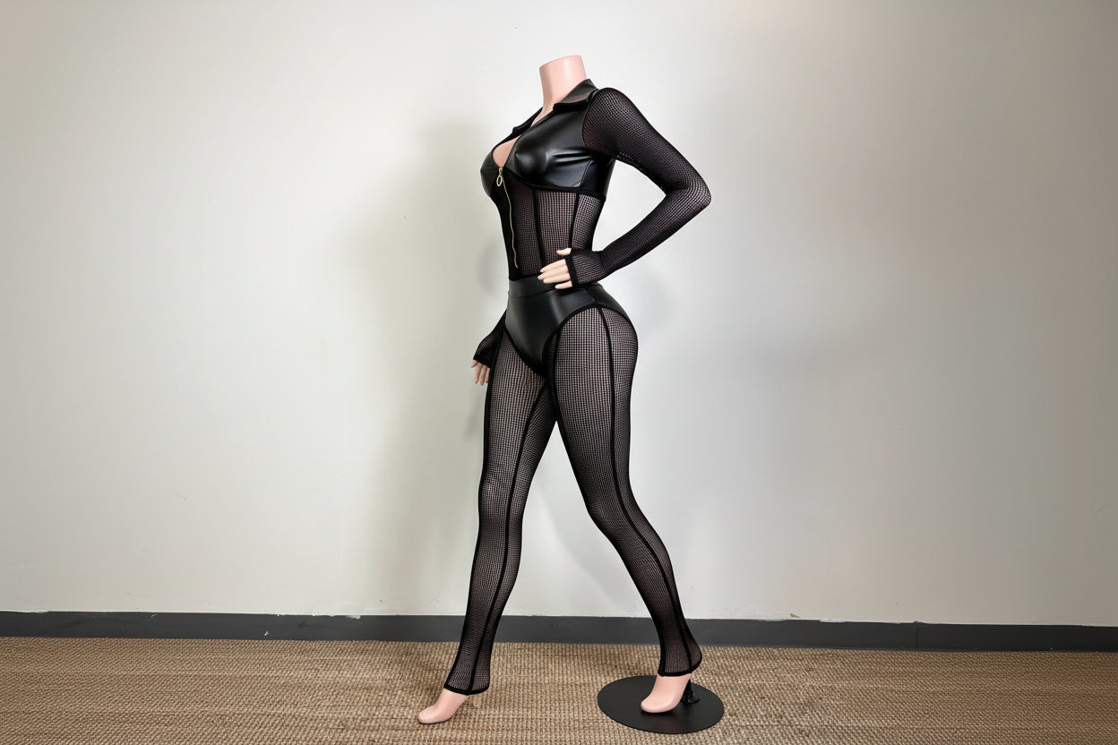 Oh So Lovely Mesh & Faux Leather Jumpsuit